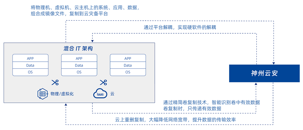 集备份、容灾功能为一体的云灾备平台产品,将需要灾备保护的操作系统、应用、数据打包成一个云镜像文件,灵活快速的复制到云灾备平台,为用户的混合 IT 环境提供统一的灾备保护。