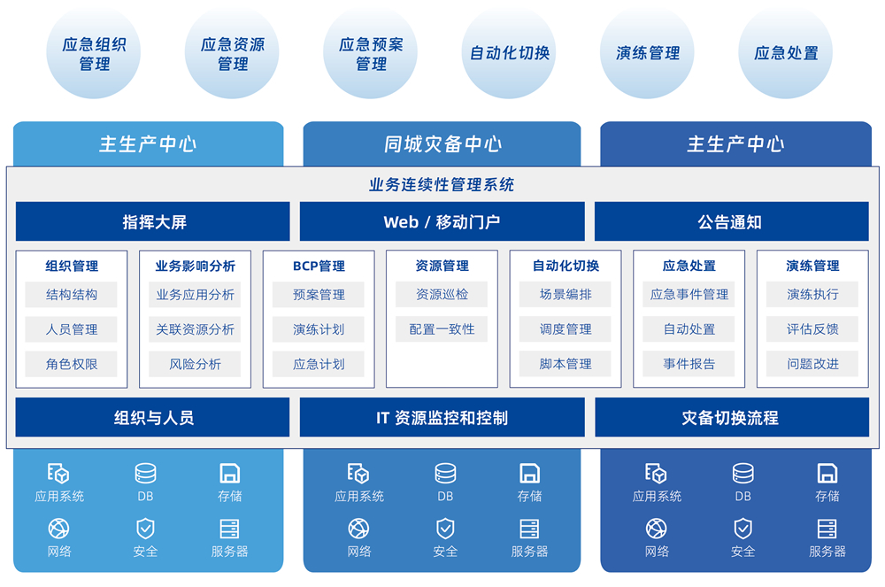 基于业务连续性全生命周期管理的设计理念,采用一体化的技术管理平台,将风险分析、业务影响度分析、预案开发和管理、应急演练、应急响应、应急恢复等业务连续性相关工作全面覆盖,帮助企业实现数字化的预案建模、资源实例化、预案演练、预案自动化执行、审计改进等各环节的闭环管理。