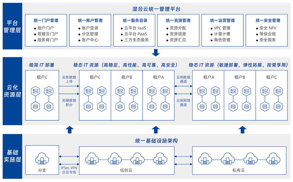 面向已部署多云、信创基础设施的行业用户,提供自助化、自动化的云服务快速交付服务。管理企业内部多个数据中心的物理、虚拟资源,以及容器、私有云、公有云资源,并对以上资源进行混合编排,提供基础软件和应用软件的自动化部署服务,以及云资源的全生命周期管理。