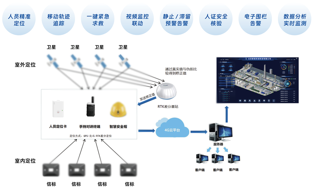 室内室外融合定位技术,确保作业人员、车辆位置可实时监测,及时预警,可有效减少或避免安全事故的发生。