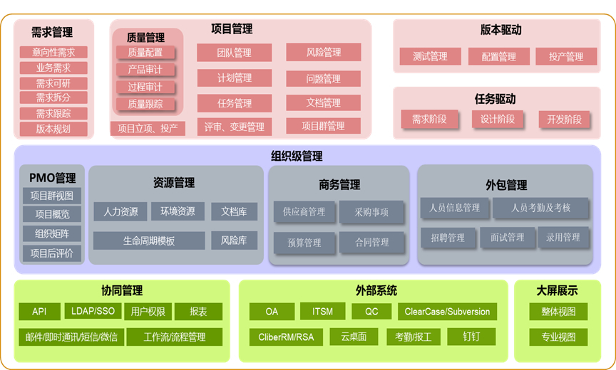 • 提供了两个全景视图和一个闭环:需求的全景视图;项目的全景视图;与运维系统集成形成从需求到运维,运维事件转需求的闭环。